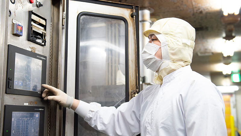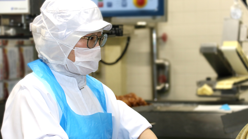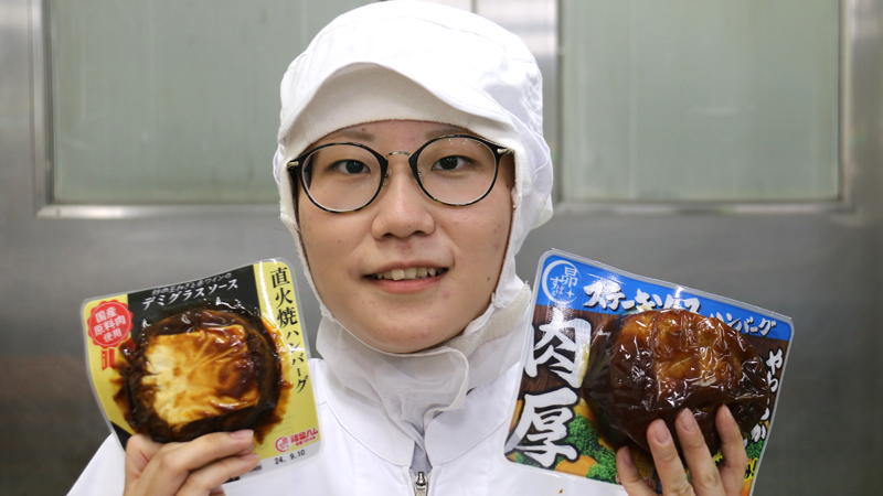 ハンバーグの製造現場で仕事をしています。仕事内容はハンバーグソースの調合を行ったり、ハンバーグの包装がスムーズに行えるよう包装機の製品切り替えや包装材に印字がきちんとできているか、真空、シールに問題がないかなどを確認し、トラブルが起きた際はいつでも対応できるようにしています。