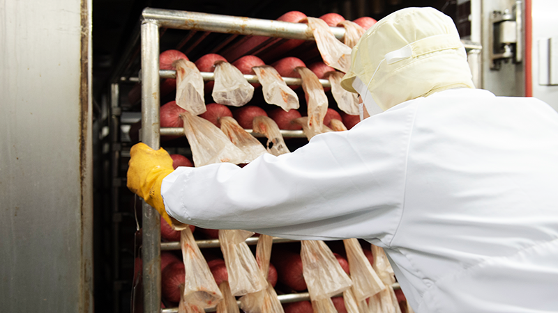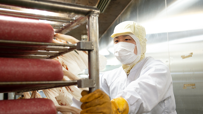 製造現場で熱処理という仕事を担当しています。熱処理の仕事としては、乾燥・スモーク・クッキングが出来る熱処理釜とお湯を張って製品の温度を上げるボイル槽を使って、ハムやベーコン、花ソーセージ、ローストビーフ、ハンバーグ等の製品を工程に従って熱処理しています。