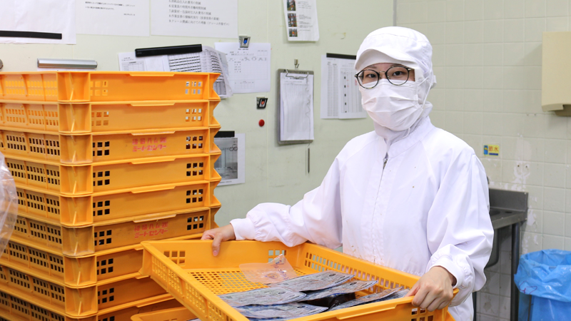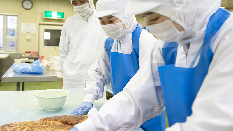 主に惣菜商品の開発を行っています。新商品案の検討や試作、既存商品のリニューアルに携わる業務を行っています。また、開発業務以外にも、広島港町ハム工房商品の製造も行います。